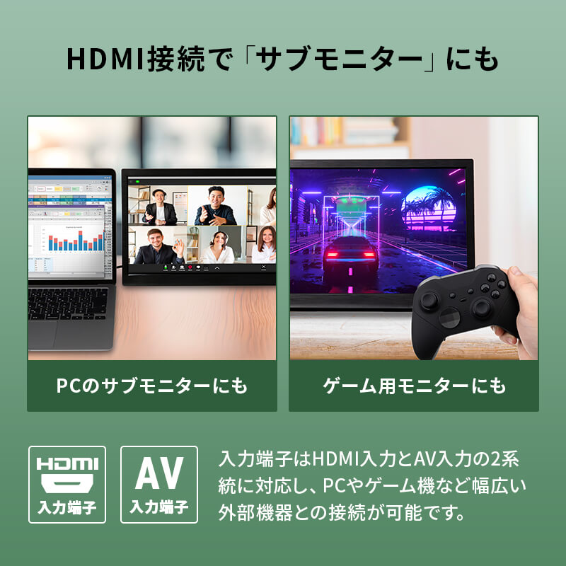 入力端子はHDMI入力とAV入力の2系統に対応し、PCやゲーム機など幅広い機器との接続が可能です。