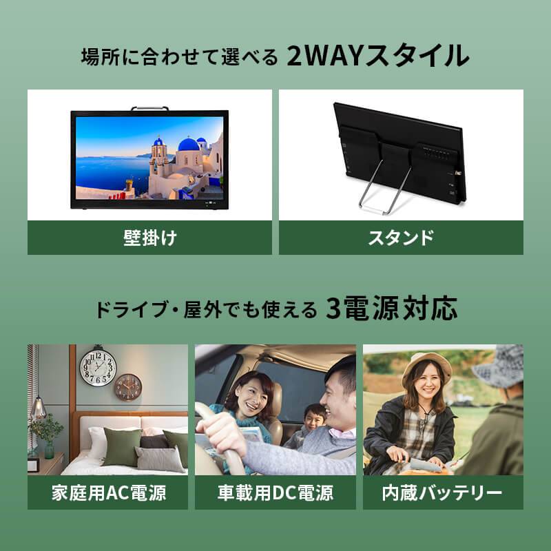 場所に合わせて選べる2WAYスタイル/ドライブや屋外でも使える3電源対応