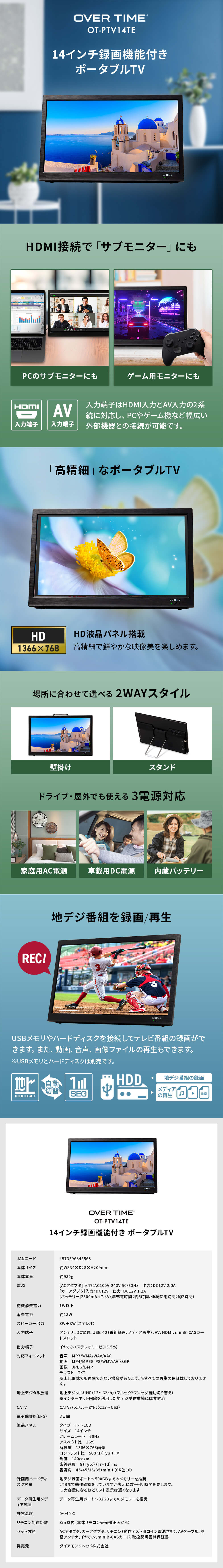 - OVER TIME 14インチ録画機能付き ポータブルTV