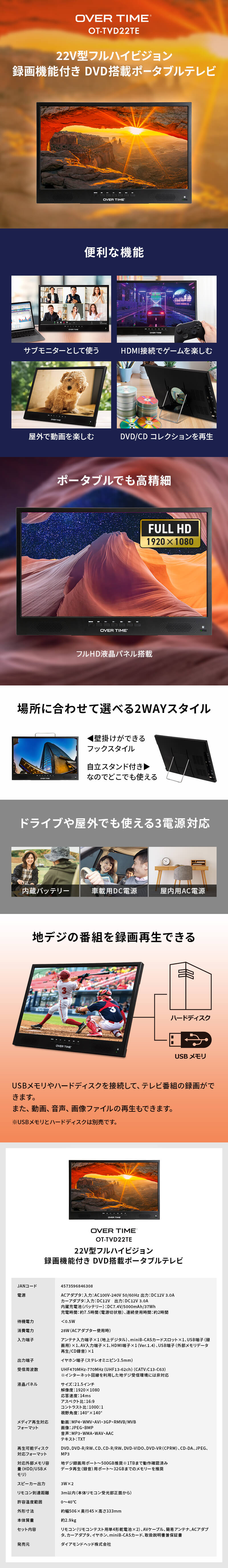 - OVER TIME 22V型フルハイビジョン録画機能付き DVD搭載ポータブルテレビ