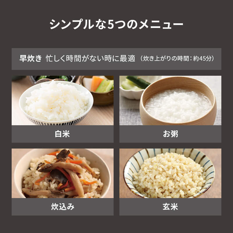 早炊き:忙しく時間がない時に最適。(炊き上がりの時間:約45分)