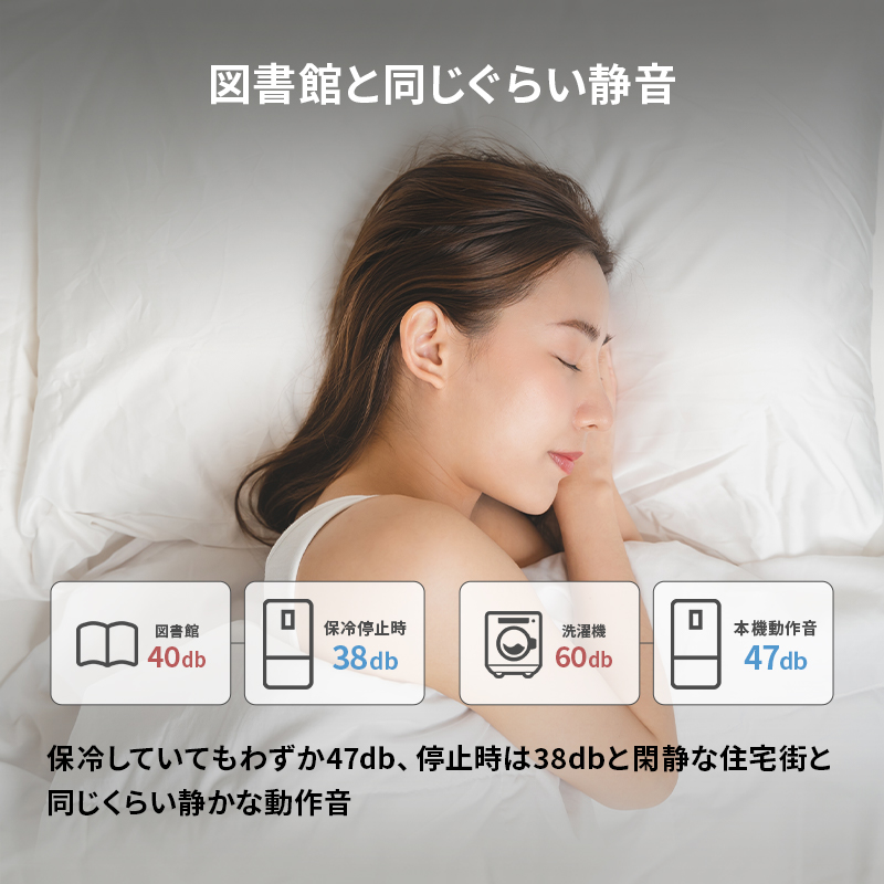 保冷していてもわずか47dB、停止時は38dBと閑静な住宅街と同じくらい静かな動作音